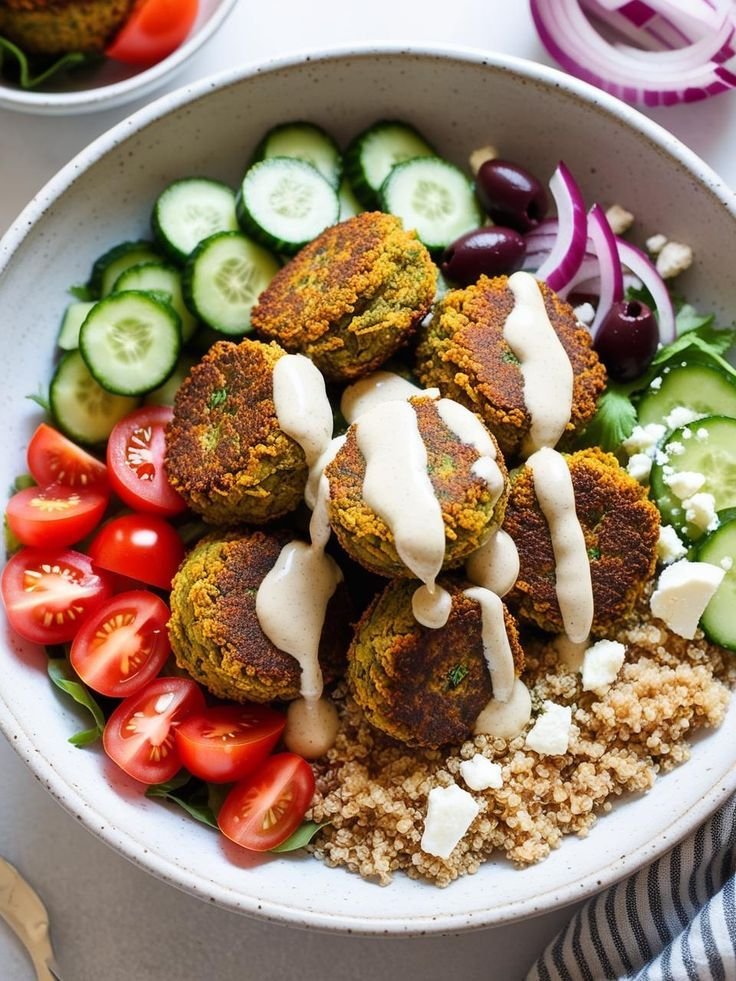 Mediterranean Falafel Bowl with Tomato-Cucumber Salad & Lemon-Herb Quinoa