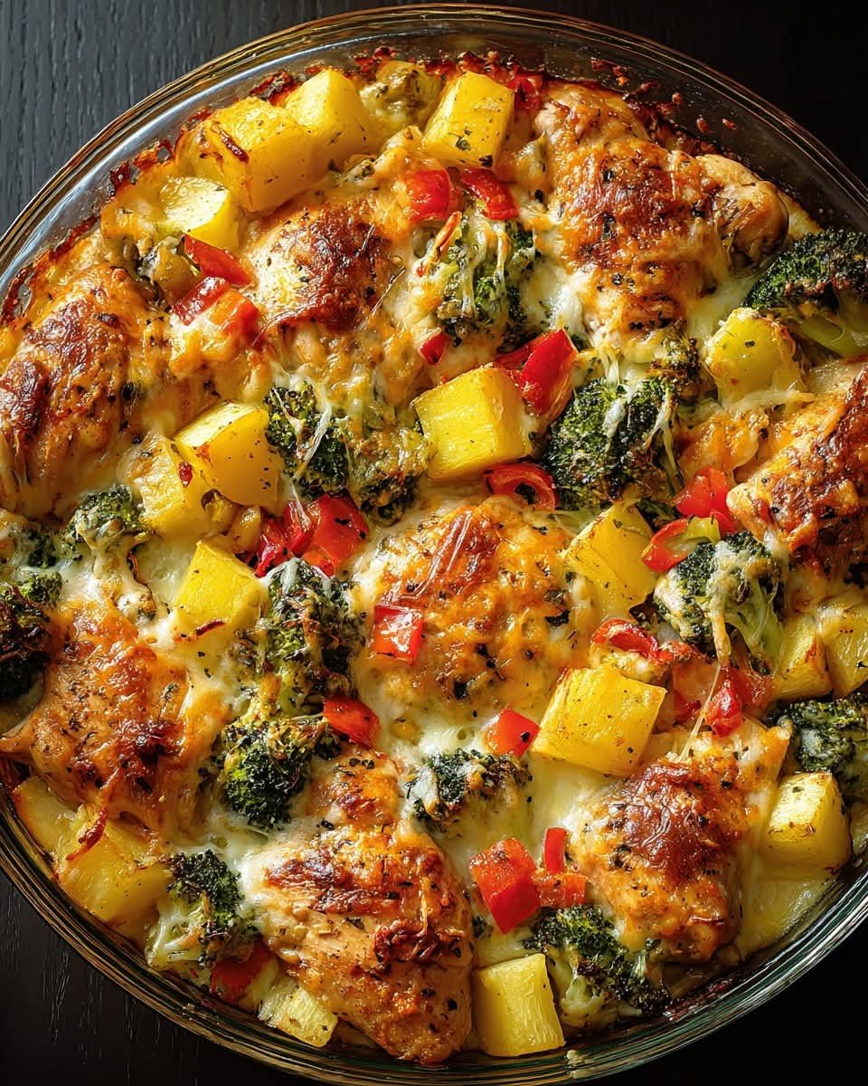 Cheesy Baked Chicken Casserole with Potatoes, Broccoli and Peppers