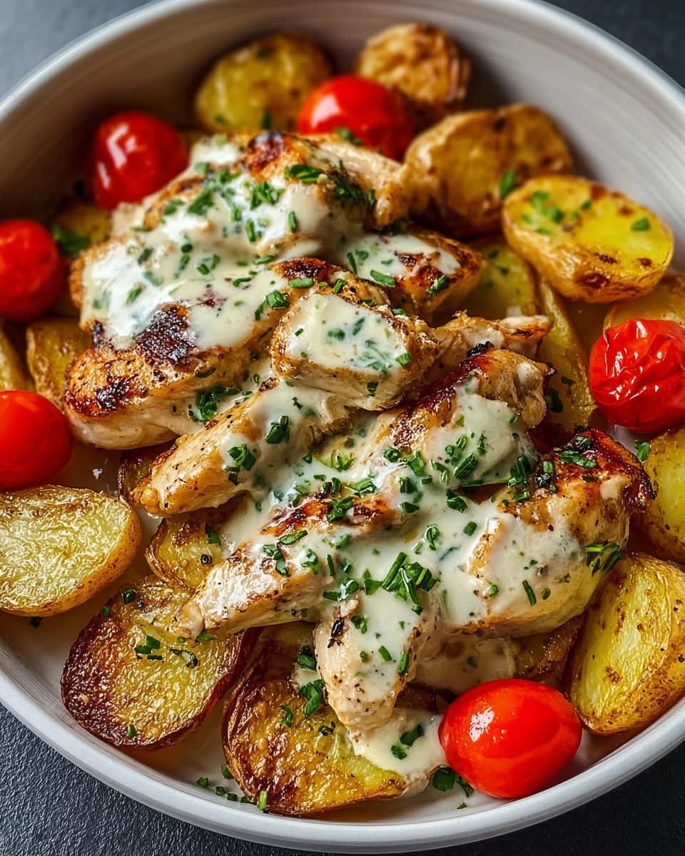Creamy Garlic Herb Chicken with Roasted Baby Potatoes and Cherry Tomatoes