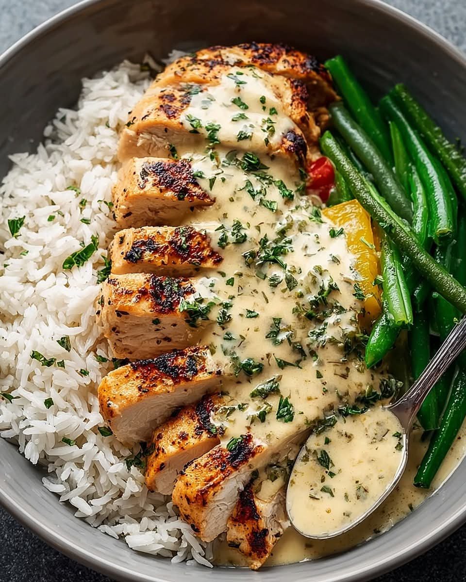 A comforting, restaurant-style meal made at home! This dish features juicy pan-seared chicken breast topped with a rich creamy herb sauce, served with fluffy rice and tender green beans. It’s balanced, flavorful, and perfect for a complete lunch or dinner.
