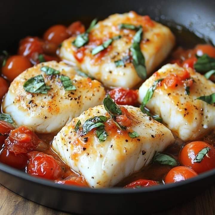 Pan-Seared Cod with White Wine Tomato Basil Sauce is a light, flavorful dish that combines tender, flaky cod fillets with a rich and aromatic sauce. The cod is pan-seared until golden brown, creating a crispy exterior while remaining moist and delicate inside. The sauce features sauteed garlic, shallots, and ripe tomatoes, which are deglazed with a splash of white wine, creating a slightly tangy and fresh base. Basil adds a bright herbal note, while a bit of butter gives the sauce a velvety finish. This dish is perfect for a quick yet elegant meal, pairing beautifully with rice, pasta, or a simple green salad.