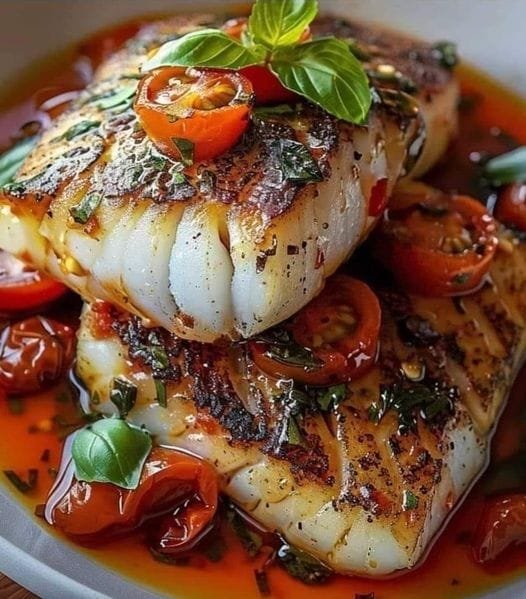 “Indulge in the vibrant flavors of the Mediterranean with our Pan-Seared Cod in Tomato Basil Sauce, a dish that embodies the essence of the region’s culinary delights. Flaky cod fillets, seared to perfection, are nestled in a rich and aromatic sauce, bursting with the sweetness of fresh tomatoes, the brightness of basil, and the subtle tang of herbs. Each bite transports you to the sun-kissed shores of the Mediterranean, where the freshness of the sea meets the warmth of the golden sun. Get ready to delight your taste buds with this exquisite culinary experience!”