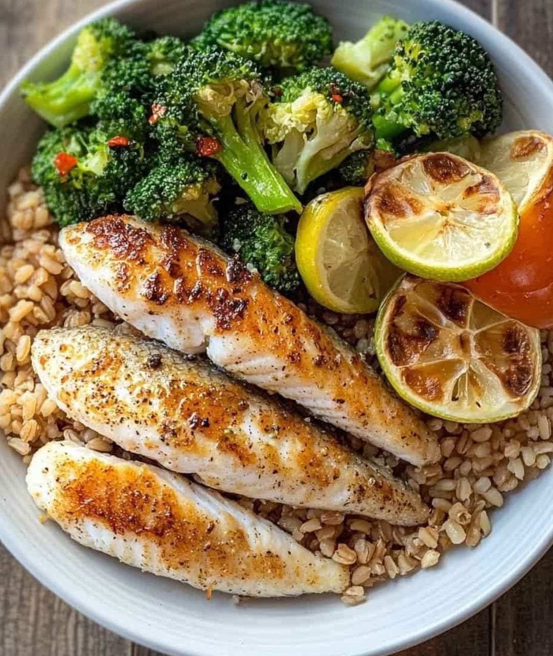 This dish is a well-balanced, nutritious meal that combines lean protein, fiber-rich whole grains, and roasted vegetables. The tilapia is pan-seared to perfection, the broccoli is roasted until tender and slightly crispy, and the brown rice provides a wholesome base to tie everything together.