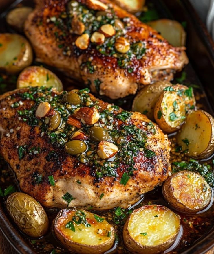 Paprika Chicken with Olive Walnut Vinaigrette & Garlic Parmesan Roasted Potatoes