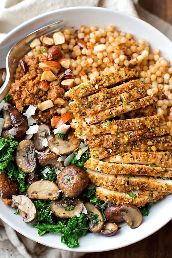 A healthy, flavorful Mediterranean-inspired meal featuring golden Parmesan-crusted chicken served with light, fluffy couscous infused with sundried tomatoes and a colorful medley of garlicky vegetables. This balanced dish is high in protein, rich in fiber, and perfect for lunch or dinner.