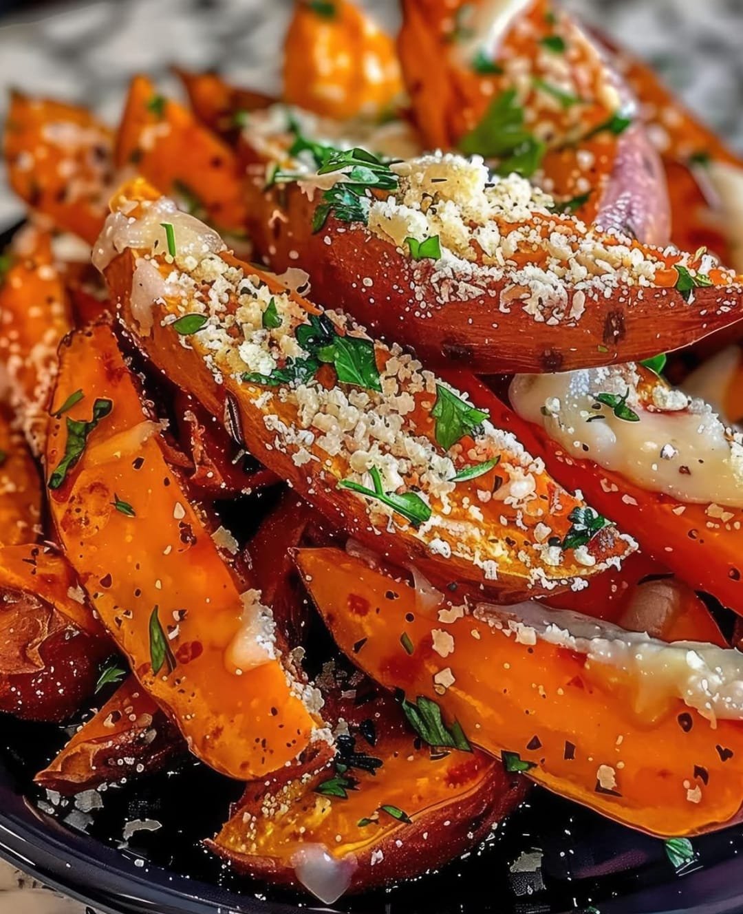 Crispy, Savory, and Flavor-Packed These Parmesan Garlic Roasted Sweet Potato Wedges are a perfect balance of crispy edges, tender centers, and bold flavors. The natural sweetness of the potatoes pairs beautifully with the savory garlic, Parmesan, and aromatic herbs. They make a fantastic side dish or snack that’s both nutritious and satisfying!