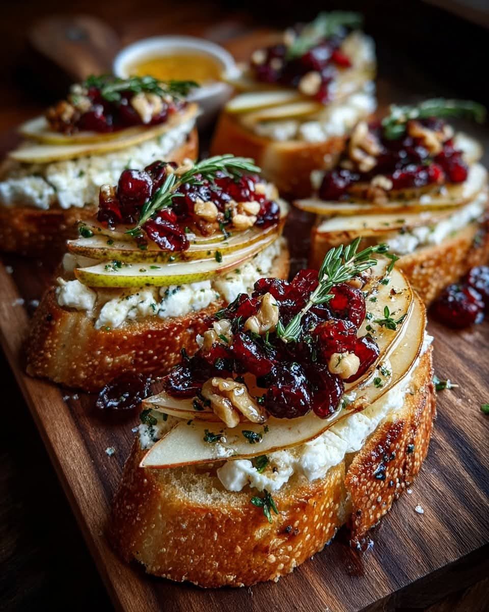 These elegant crostini are a perfect balance of sweet, savory, and tangy flavors. Crisp toasted bread is topped with creamy Brie, fresh pear slices, and tart cranberry, finished with a drizzle of fragrant thyme honey. Ideal for holiday gatherings, appetizers, or sophisticated snacks, they’re quick to assemble yet impressive on any platter.