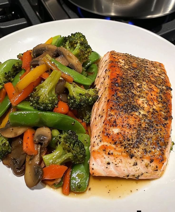 This Pepper-Crusted Salmon with Veggies Stir-Fry is a healthy, flavorful, and colorful Mediterranean-style dish. Salmon fillets are pan-seared with a black pepper crust for a light, aromatic flavor and served with a medley of sautéed vegetables. High in protein, omega-3 fatty acids, and vitamins, it’s a perfect dinner for anyone looking for a balanced and satisfying meal.