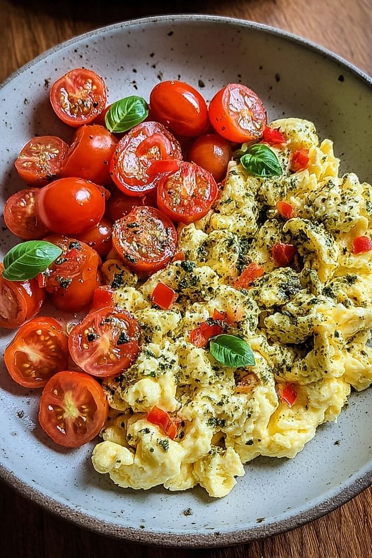 Fluffy scrambled eggs get a flavor upgrade with a swirl of basil pesto and juicy blistered cherry tomatoes. The combination is creamy, aromatic, and packed with Mediterranean goodness. Serve it over toasted sourdough or alongside avocado for a fresh, energizing meal.