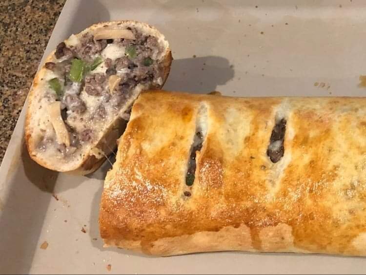 An entertaining take on the classic Philly Cheesesteak sandwich. Very simple to prepare, you can make this simply or creatively if you already have the materials on hand. This rolled-up stromboli is delicious any time of day! Or not, share this with your pals. It’s your decision!