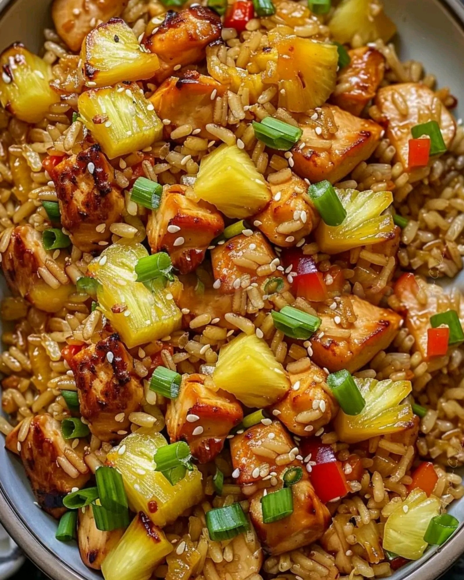This delightful dish combines succulent pieces of chicken with the tropical sweetness of pineapple, all served over a bed of fluffy rice. The chicken is marinated and cooked to perfection, ensuring it’s juicy and flavorful. Pineapple chunks add a burst of freshness and a hint of tanginess, while the rice soaks up all the delicious juices, making every bite a harmonious blend of savory and sweet. Ideal for a quick weeknight dinner or a special family meal, Pineapple Chicken and Rice is a vibrant and satisfying dish that’s sure to please everyone at the table.