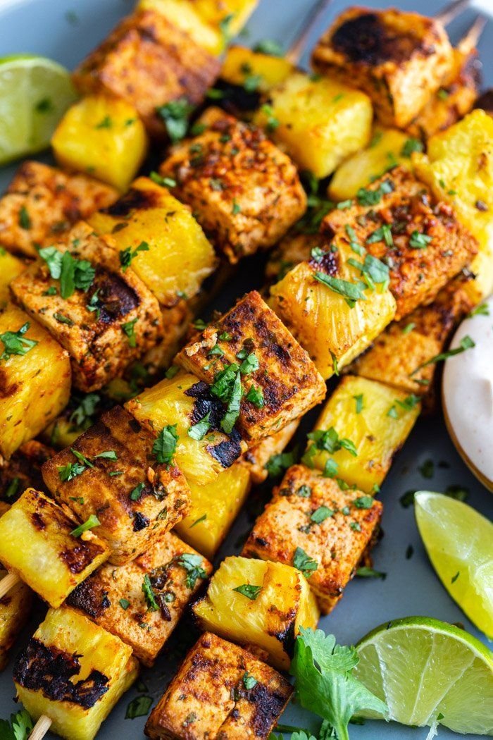 Thread tofu, pineapple, and bell peppers alternately onto skewers.