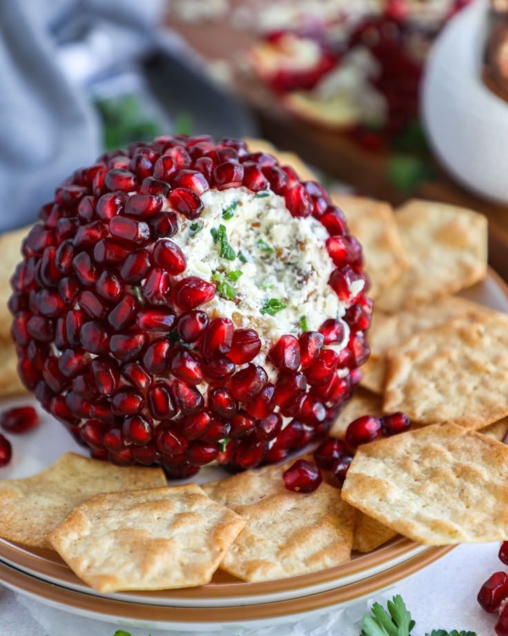 A creamy, savory cheese ball made with sharp white cheddar and cream cheese, rolled in jewel-like pomegranate seeds and herbs.It’s rich but balanced, visually stunning, and perfect for December entertaining.