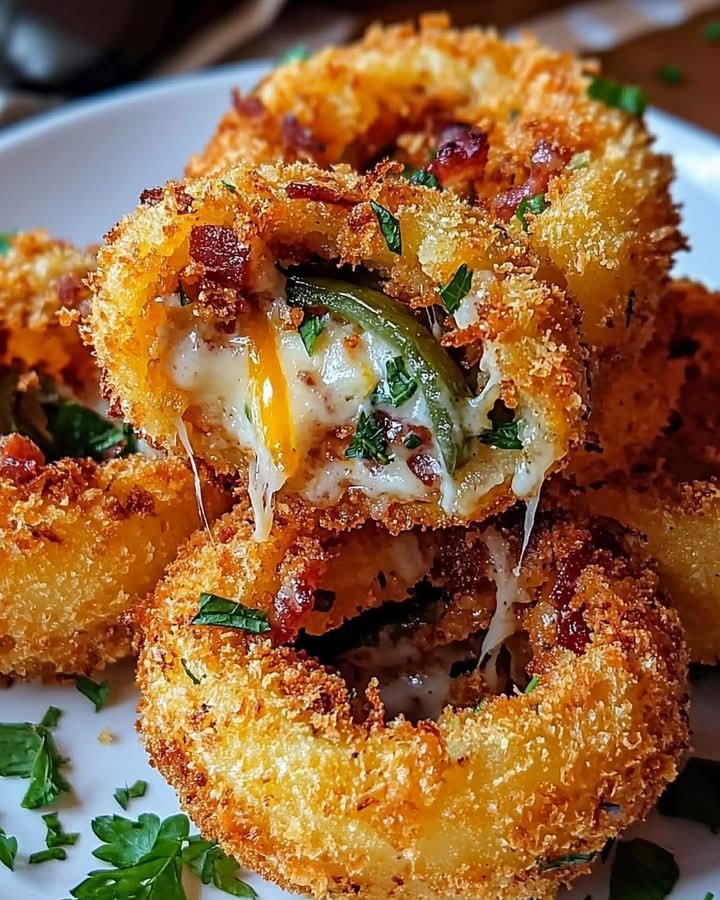 A creative twist on two popular appetizers—jalapeño poppers and onion rings—this dish features thick onion rings stuffed with a creamy, cheesy jalapeño filling, coated in breadcrumbs, and fried until golden and crispy. It’s a bold, spicy, and indulgent treat perfect for game day, parties, or a unique side dish.