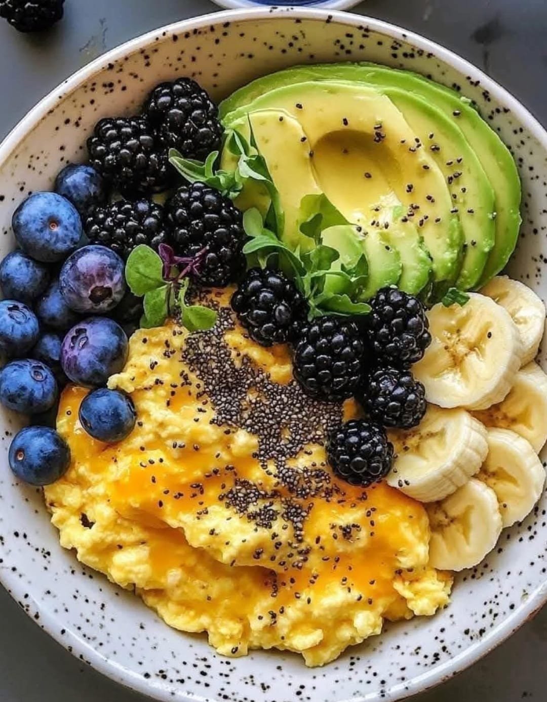 This Power Breakfast Bowl is a nutrient-dense, high-protein meal that fuels your body for the day ahead. It combines fluffy scrambled eggs for protein, creamy avocado for healthy fats, and fresh berries for antioxidants—a perfect balance of macronutrients to keep you full and energized.