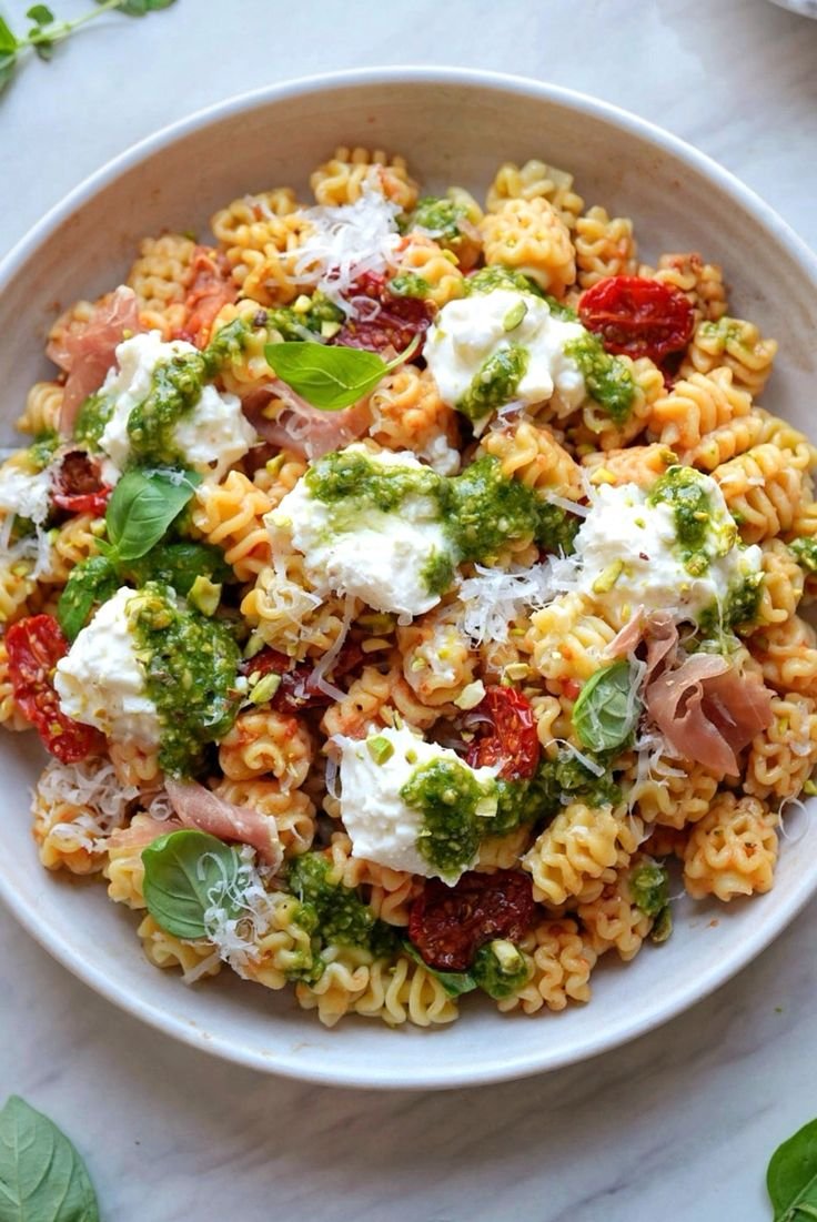 Al dente pasta tossed with juicy cherry tomatoes, creamy mozzarella, fresh basil, and thin slices of salty prosciutto, finished with a light balsamic vinaigrette.it’s Mediterranean freshness in a bowl, perfect for lunch, a picnic, or as a side for dinner.