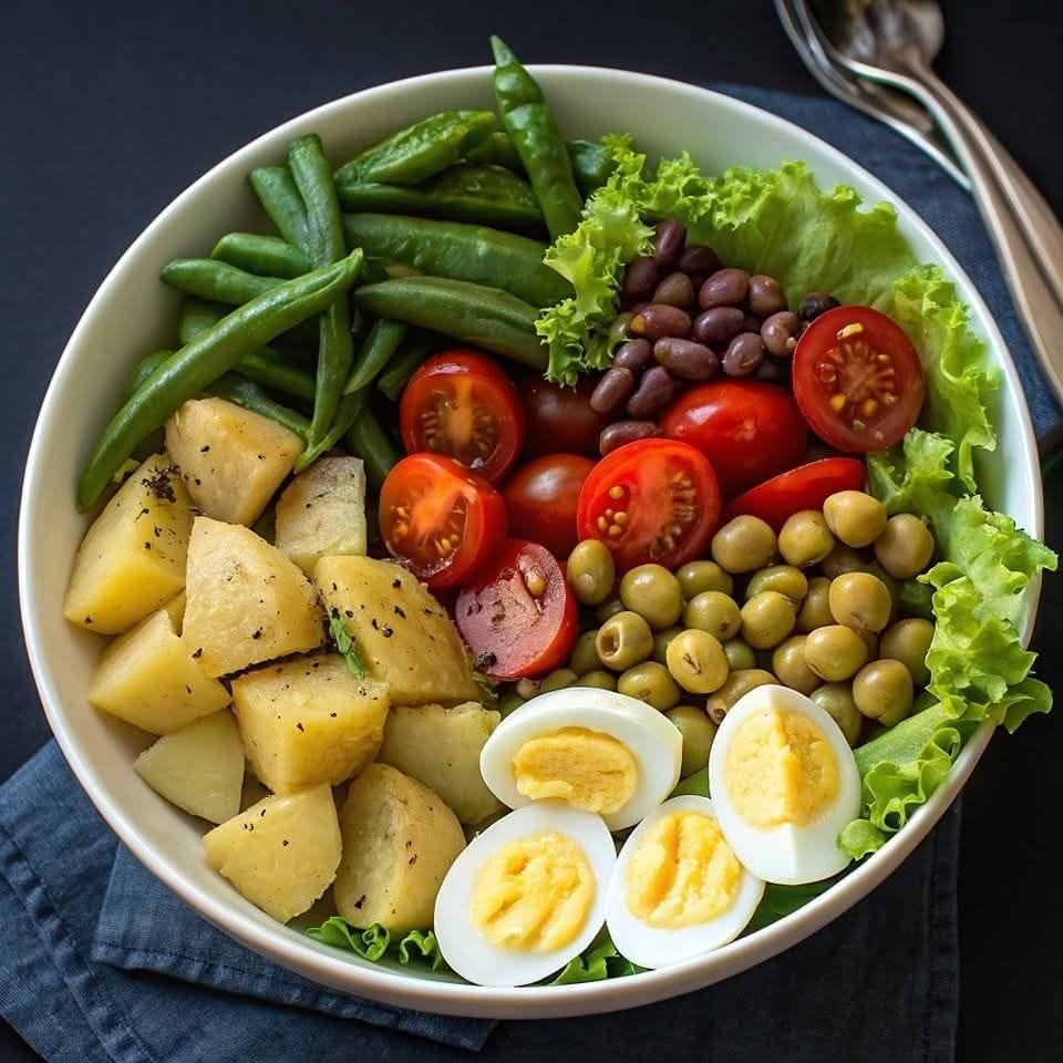 Top with the eggs, potatoes, green beans, cherry tomatoes, black beans, and olives.