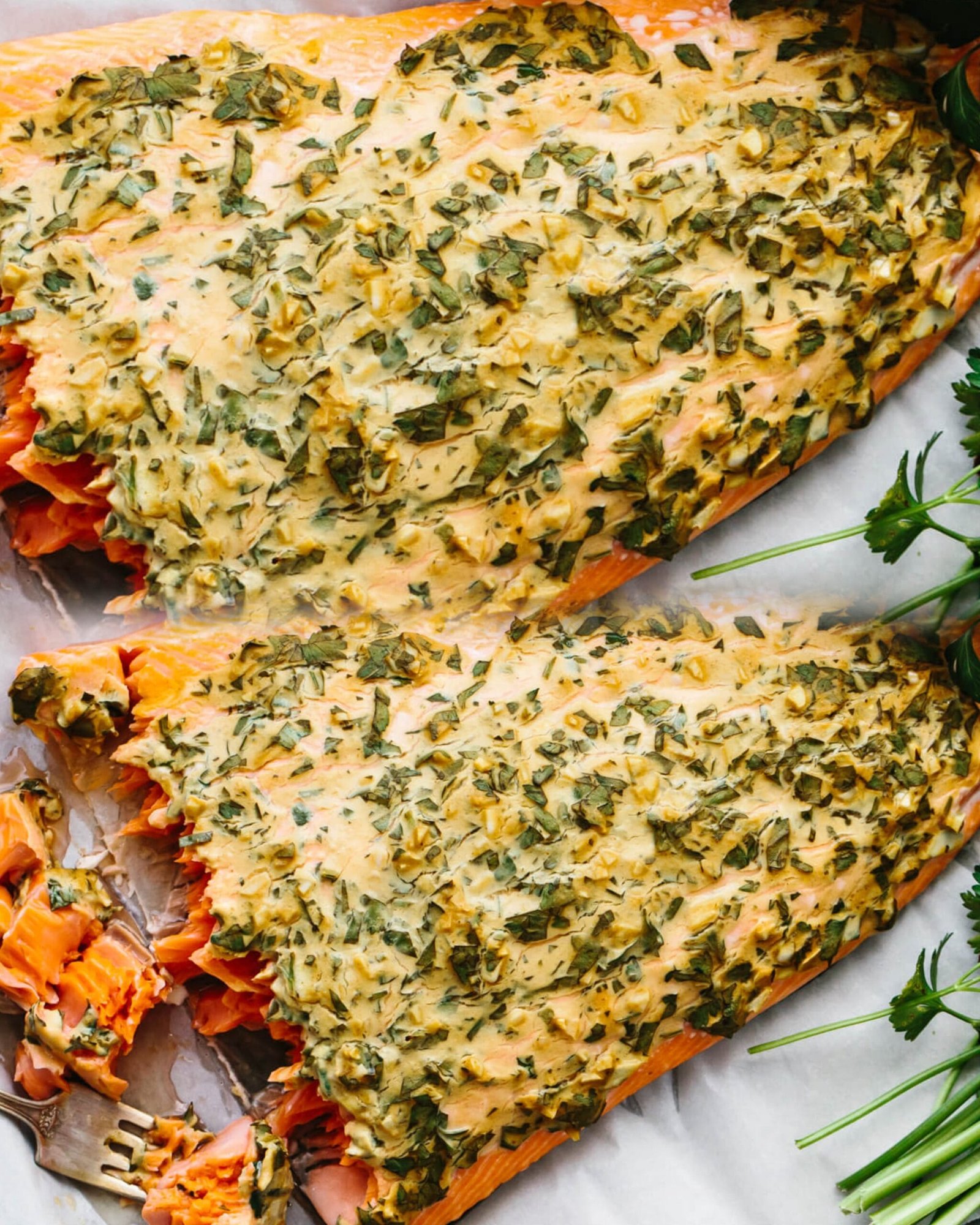 Place the salmon on a parchment lined baking tray and generously coat the top of the salmon with the herbed mustard mix.