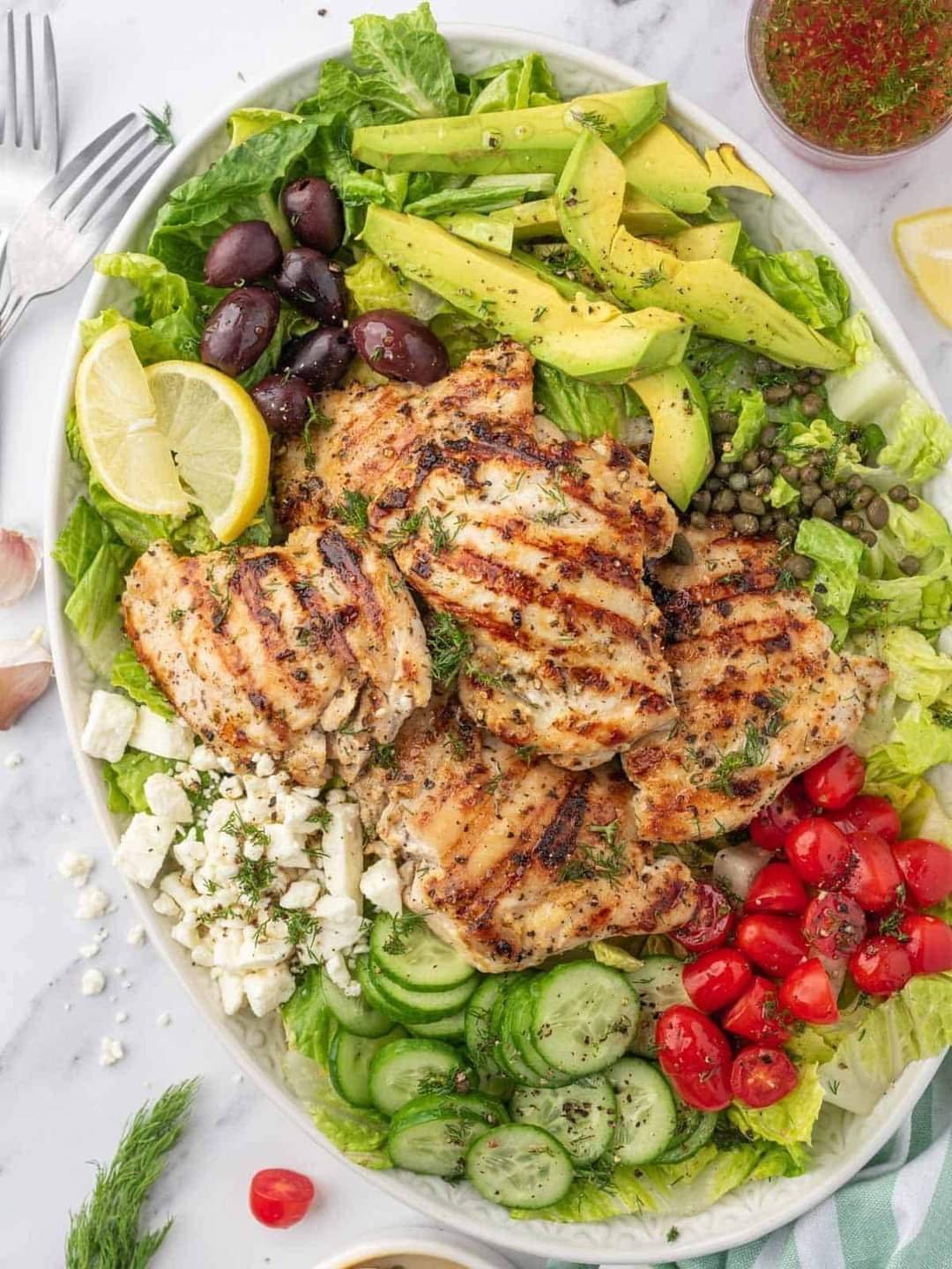 This greek chicken salad recipe combines tender chicken thighs coated in a greek yogurt marinade with a tangy lemon vinaigrette and a slew of vegetables for the perfect meal prep or main dish salad. Kalamata olives, capers and feta cheese round out this Greek salad with chicken giving it a classic Mediterranean flavor.