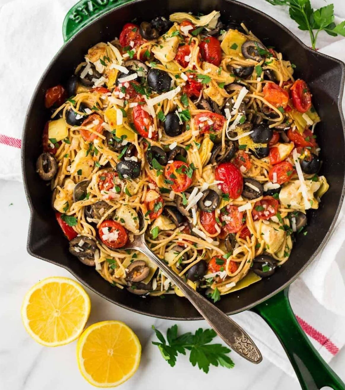 ⭐Add the pasta to the skillet and toss to coat. Add the artichokes and olives.