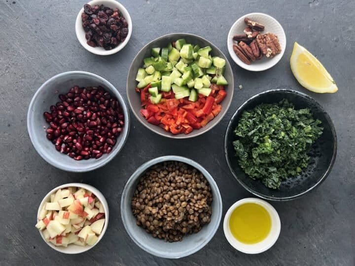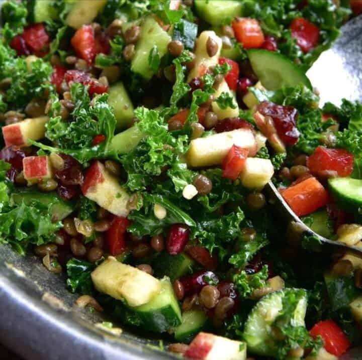A large bowl of salad is a great work lunch. You can finish it fast and get back to your desk.It is also a great way to attain good health.The below recipe got me hooked to it, the first time I had it.This is one of the most common lentil salad you can see in your local market. It is inspired from Moroccan lentil salad recipe. There are few core ingredients for this recipe. Lentils, kale & dried berries , you can add any other crunchy fresh fruits such as apples and pears.