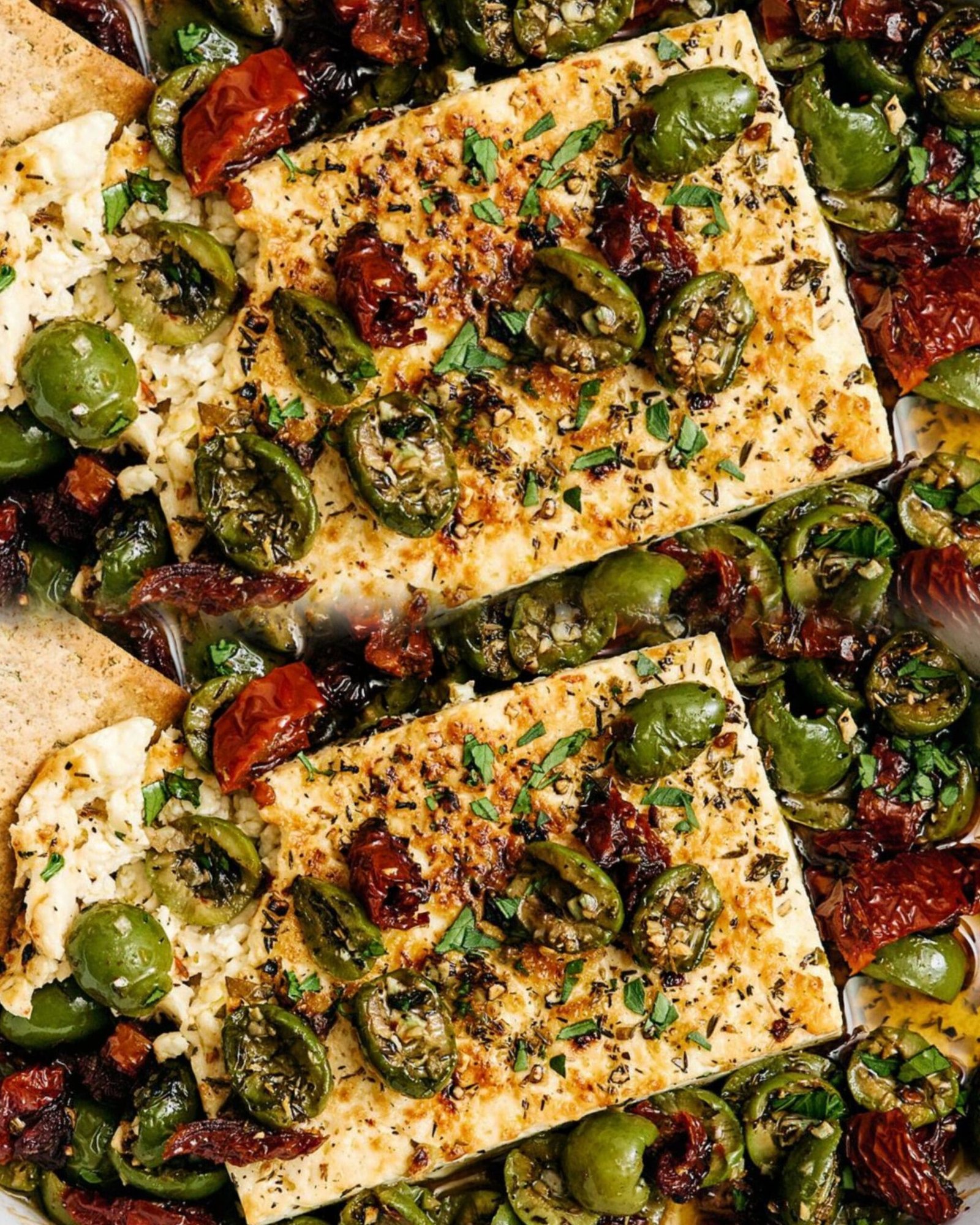 This easy Mediterranean baked feta with an herb-infused olive and sun-dried tomato topping is officially my signature appetizer for dinner parties.