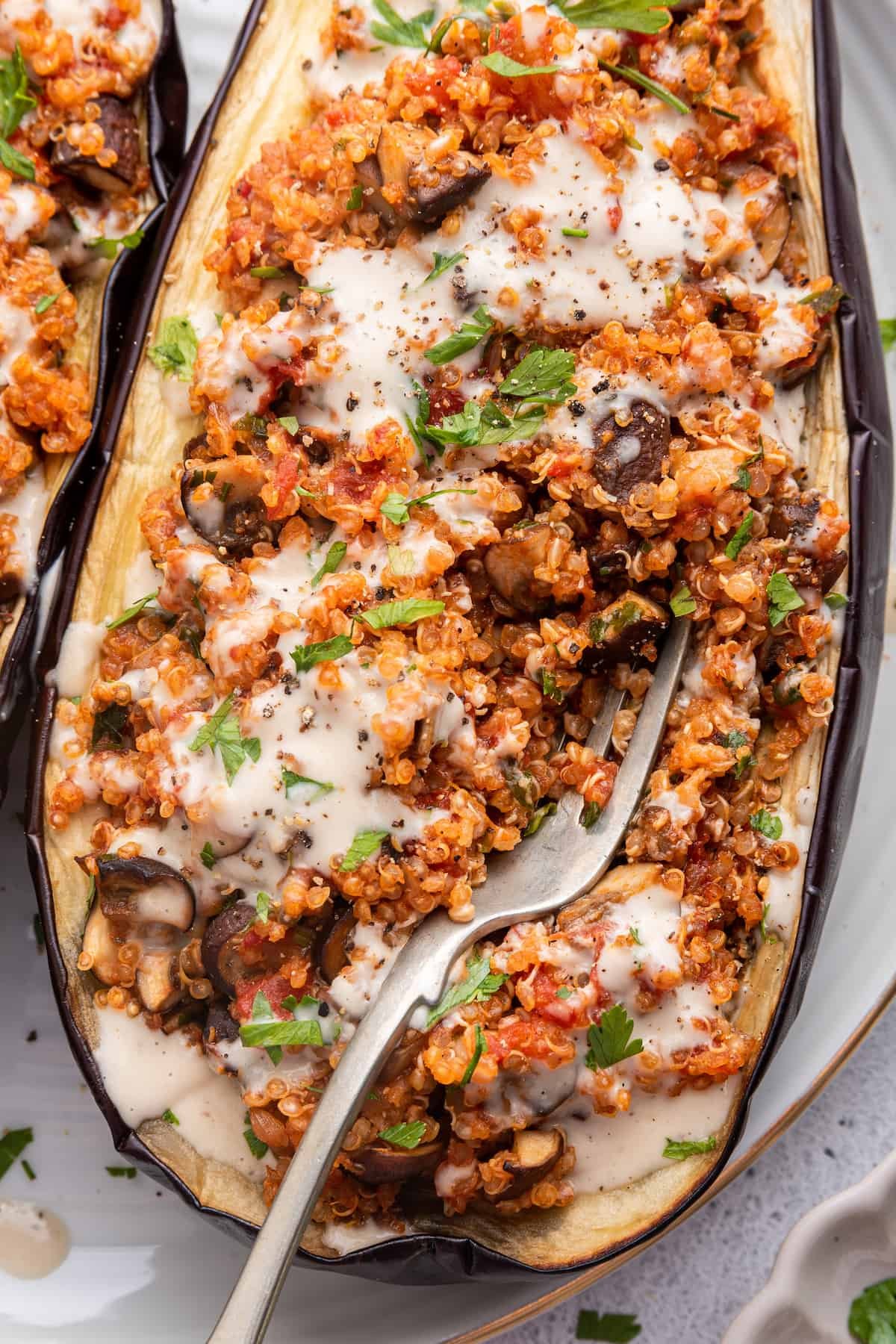 You’re going to fall in love with this Mediterranean quinoa-stuffed eggplant recipe! It’s full of flavor, packed with veggies, and takes just 30 minutes to make!
