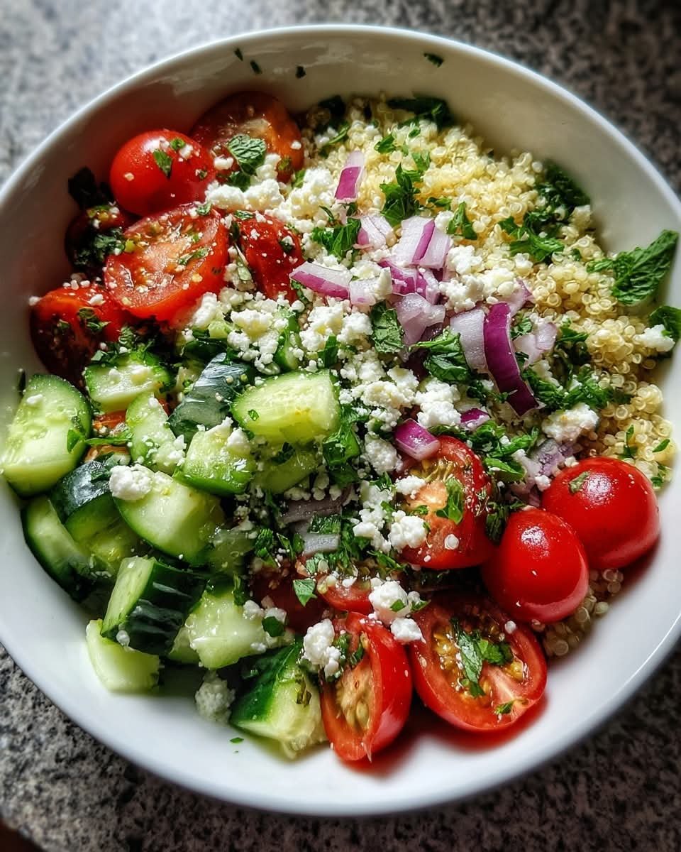 Fresh herbs, crisp cucumbers, juicy tomatoes, and fluffy quinoa come together in this refreshing tabbouleh-inspired bowl. Finished with tangy lemon-olive oil dressing and a sprinkle of feta, it’s light yet filling – perfect as a main salad or side dish.