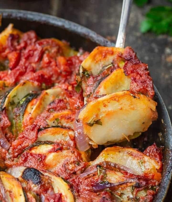 A helpful hint for cooks is that if you do not feel like arranging the veggies in circular rows, you may use a big au gratin dish such as this one or a wide and deep rectangular baking dish such as this one. In accordance with the instructions, pour half of the tomatoes into the baking dish so that they cover the bottom. After that, spread the veggies out in a level layer in the dish, and then cover the vegetables with the remaining tomatoes and the EVOO mixture. Pay attention to the directions that are provided here. To a greater extent, it will resemble this dish.