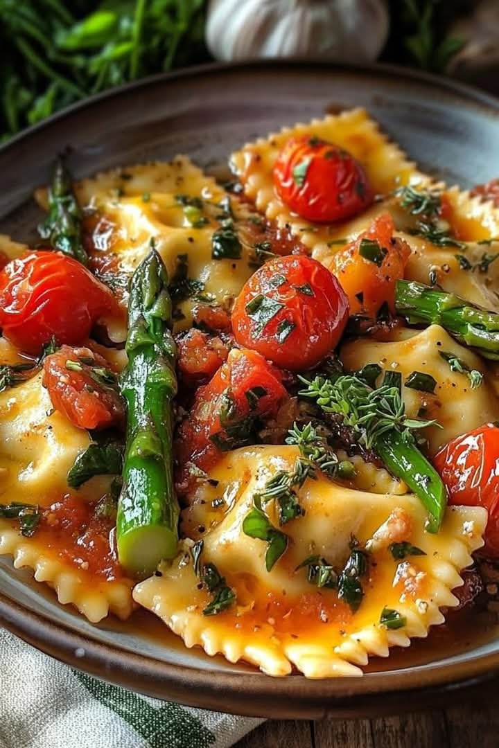This delightful ravioli dish combines tender pasta with juicy cherry tomatoes, crisp asparagus, and a medley of fresh herbs. The light, flavorful sauce enhances the natural sweetness of the tomatoes while the asparagus adds a fresh, slightly earthy bite. It’s a quick and elegant meal that’s perfect for busy weeknights or special occasions.