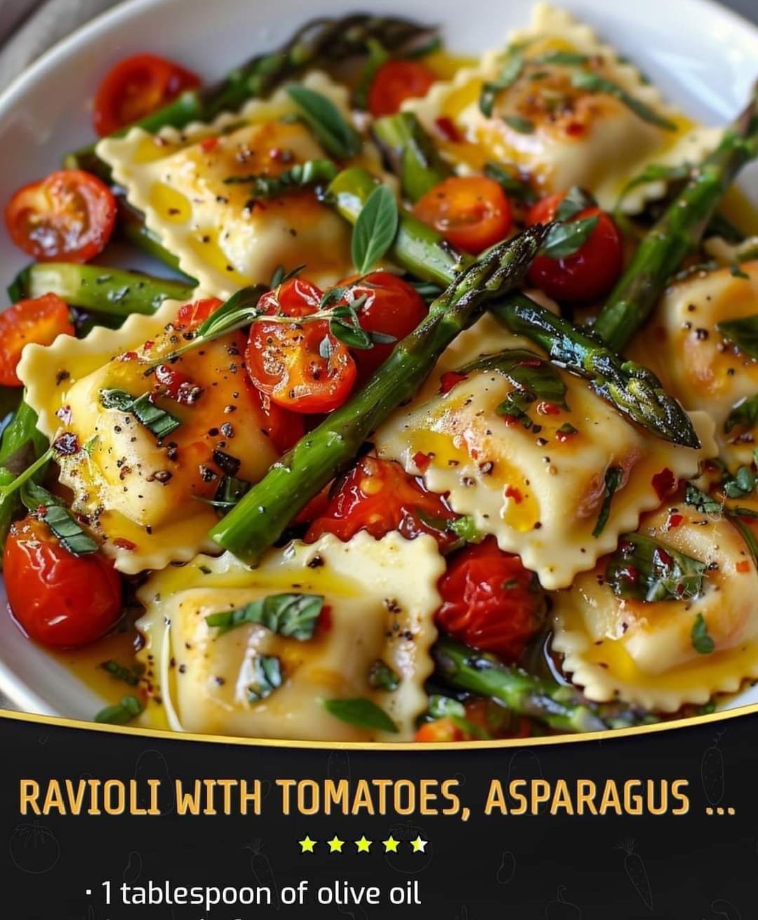 This dish features tender ravioli filled with cheese or vegetables, tossed in a light, flavorful sauce made from juicy cherry tomatoes, fresh asparagus, and aromatic garlic. The tomatoes burst into a slightly sweet and tangy sauce, while the asparagus adds a delicate crunch. Fresh herbs like basil and parsley enhance the dish with their vibrant flavors, and a sprinkle of Parmesan cheese adds a savory finish. The garlic is sauteed to perfection, releasing a rich aroma that ties all the ingredients together, creating a simple yet elegant Italian-inspired meal.