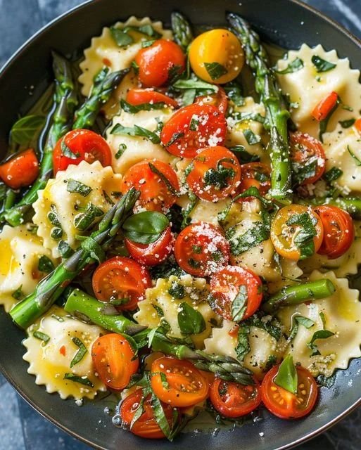 This quick Mediterranean-style ravioli skillet is a fresh, flavorful meal made with tender ravioli, juicy cherry tomatoes, crisp asparagus, and fragrant garlic. Everything cooks in one pan, making it a simple 20-minute dinner that feels light yet satisfying.