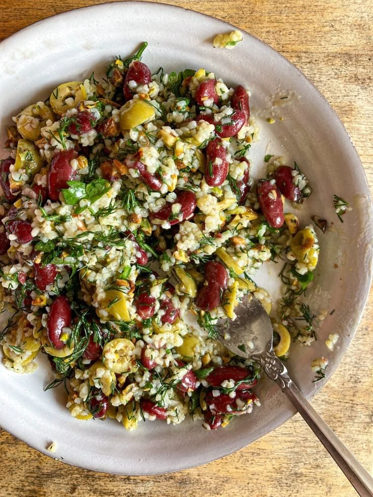 A vibrant and protein-packed Mediterranean salad featuring nutty bulgur, earthy red beans, briny olives, crunchy pistachios, and loads of fresh herbs. It’s refreshing yet hearty — perfect as a light main, side dish, or part of a mezze spread.