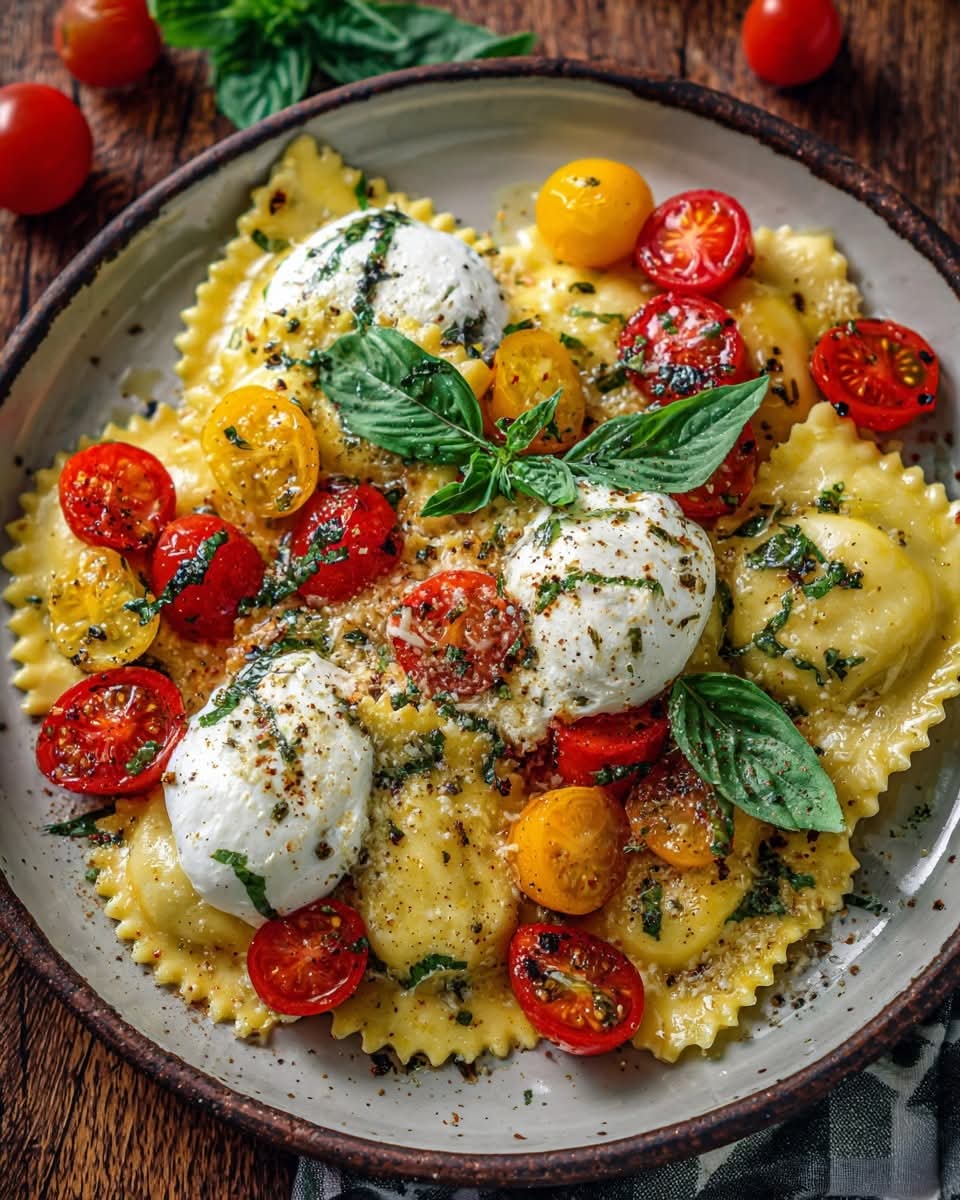 This dish brings together delicate ricotta and lemon zest ravioli with a light, silky sauce of burst cherry tomatoes, garlic, and olive oil. Finished with creamy burrata and fresh basil, it’s an elegant yet approachable recipe that balances richness with freshness. Perfect for a special dinner or a summer-inspired pasta night.