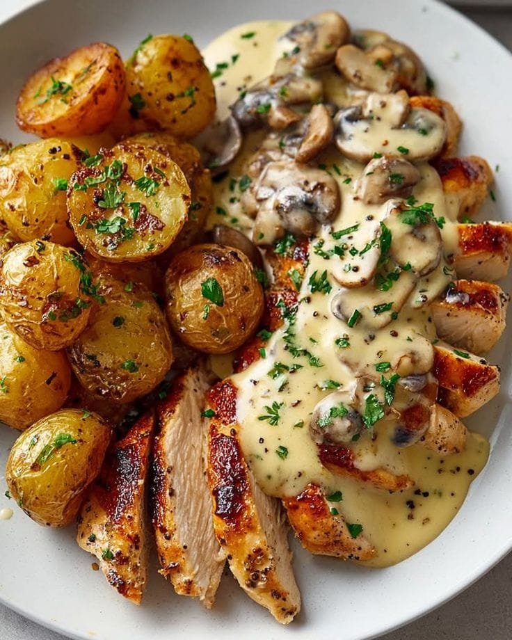 This Roast Chicken and Mushrooms with Garlic Sauce and Roasted Potatoes is a rustic, home-style dish bursting with deep roasted flavors. Tender, juicy chicken is roasted with golden mushrooms and aromatic herbs, then paired with crispy roasted potatoes and drizzled with a rich, garlicky sauce. It’s cozy enough for a weeknight dinner yet impressive enough for guests.