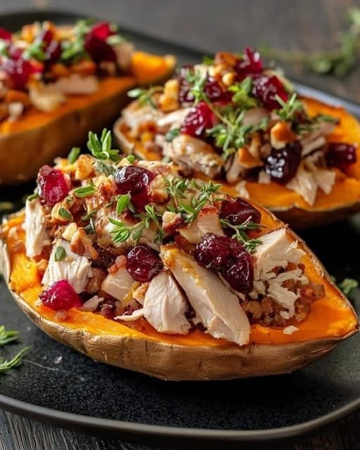 Once the sweet potatoes are done baking, remove them from the oven and let them cool slightly. Carefully slice them open lengthwise and fluff the insides with a fork. Spoon the turkey and cranberry mixture generously into each sweet potato.