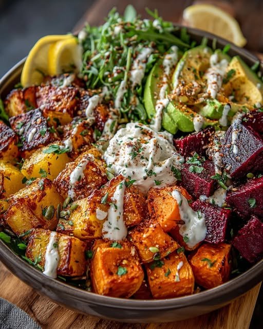 This roasted beet, sweet potato, and avocado salad is a colorful, nourishing dish that balances earthy roasted vegetables with creamy whipped ricotta and a bright lemon-tahini drizzle. The sweetness of roasted root vegetables pairs beautifully with smooth avocado, while the ricotta adds a soft, velvety base that feels rich without being heavy. A tangy dressing ties everything together, giving the salad freshness and depth. It works well as a hearty lunch, a vibrant side dish, or even a light vegetarian dinner. The textures range from tender roasted vegetables to silky cheese and creamy avocado, creating a satisfying bite every time. With simple ingredients and straightforward preparation, this recipe is approachable yet elegant enough for entertaining. Whether served warm or at room temperature, it brings together wholesome ingredients and bold flavors in a balanced, visually appealing way that highlights seasonal produce and comforting Mediterranean-style elements.