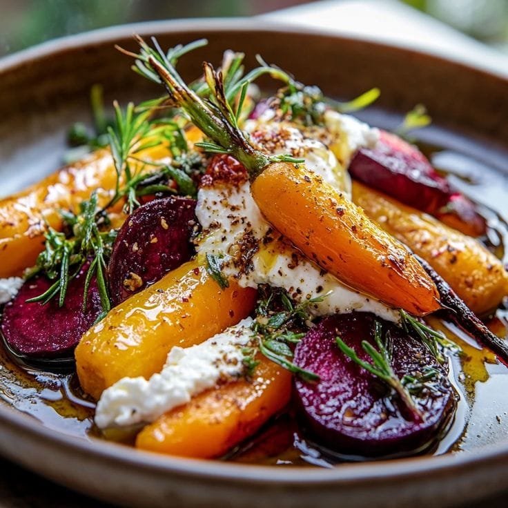This elegant salad features roasted beets and carrots, naturally sweet and caramelized, paired with creamy burrata cheese, peppery arugula, toasted nuts, and a tangy balsamic-lemon vinaigrette. It’s wholesome, beautiful, and perfect for any season.