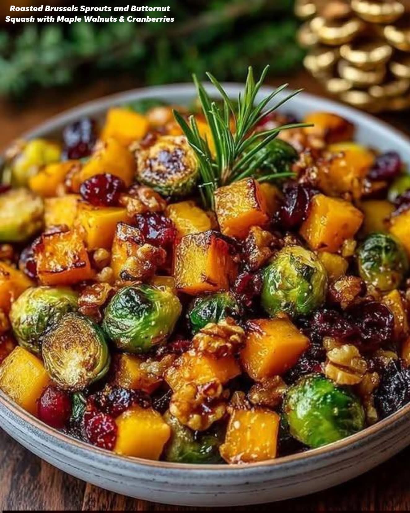 Roasted Brussels Sprouts and Butternut Squash with Maple Walnuts & Cranberries