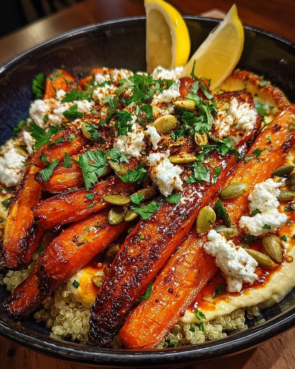This vibrant bowl features caramelized roasted carrots tossed with warm spices, paired with fluffy grains, creamy hummus, tangy feta, and fresh Mediterranean toppings. It’s hearty yet refreshing, ideal for lunch, dinner, or meal prep.