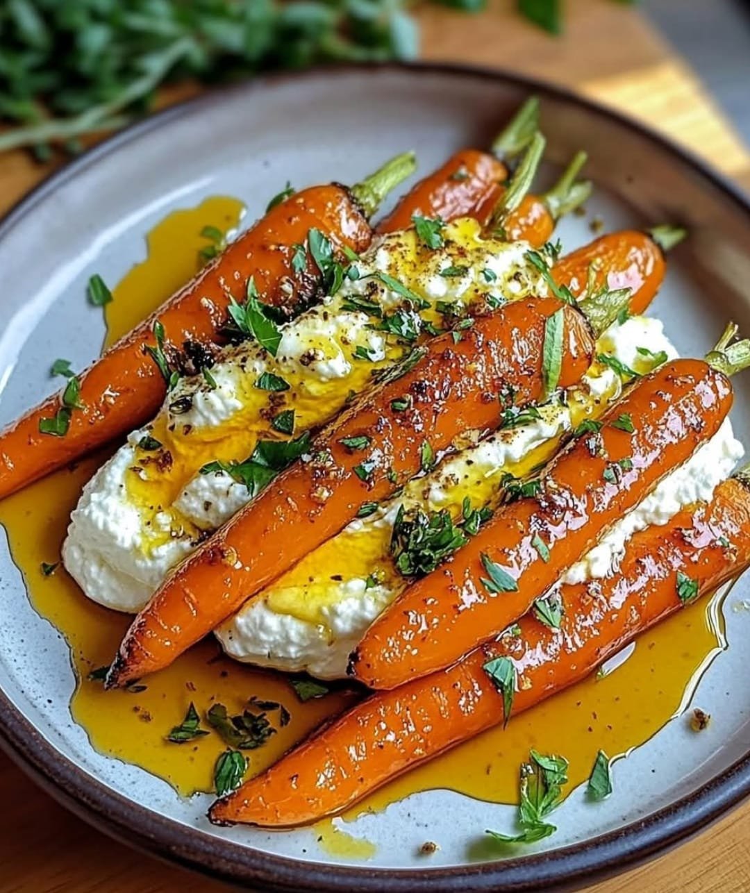 Tender roasted carrots, sweet and caramelized from high-heat roasting, are served over a cloud of whipped ricotta and drizzled with spicy-sweet hot honey. This dish is both rustic and refined, perfect as a side, starter, or even a light lunch with crusty bread.