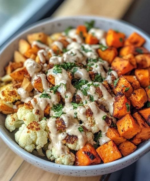 Indulge in the vibrant flavors and textures of this nutritious bowl, expertly combining the comforting warmth of roasted cauliflower and sweet potatoes with the creamy, sweetness of maple tahini sauce.