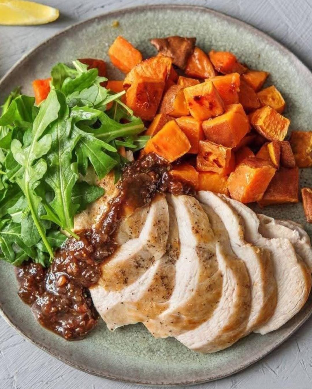 Enjoy this simple, healthy, and flavorful Roasted Chicken and Sweet Potato Plate!