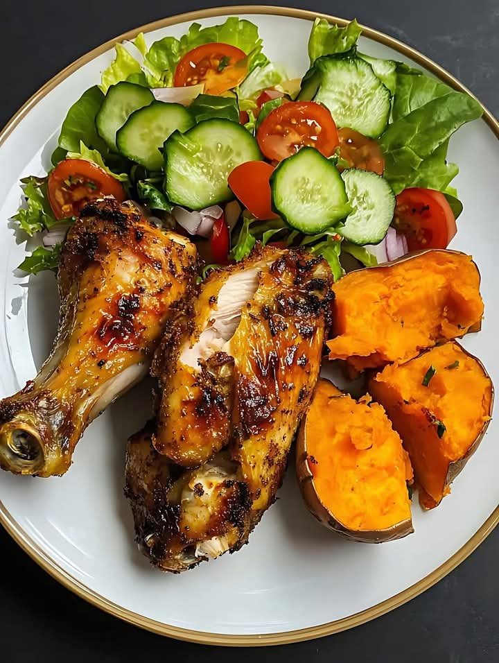 This wholesome dish features succulent, herb-roasted chicken paired with caramelized sweet potatoes and a crisp fresh salad. It’s packed with protein, fiber, and essential vitamins—perfect for a nutritious lunch or dinner.