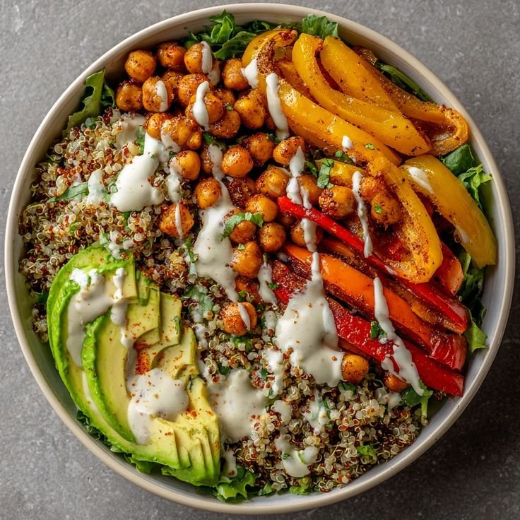 This bowl combines crispy roasted chickpeas, fluffy quinoa, roasted bell peppers, creamy avocado, and a zesty dressing. It’s perfect for meal prep, vegan meals, or a satisfying lunch or dinner.
