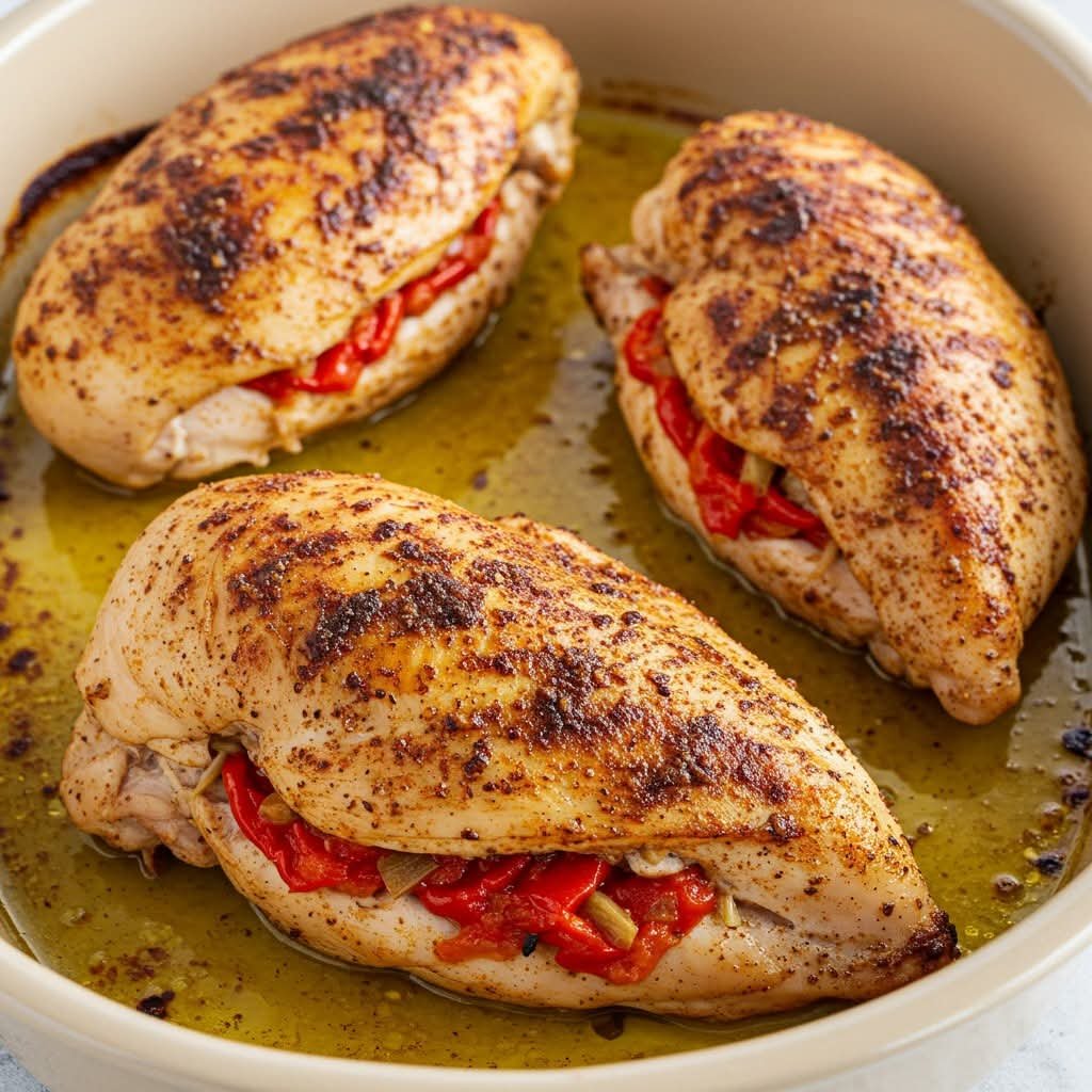 This Roasted Peppers and Garlic Stuffed Chicken Breast is a flavorful and juicy dish, perfect for a weeknight dinner or special occasion. The chicken breasts are stuffed with sweet roasted peppers, creamy cheese, and aromatic garlic, then baked to perfection. Serve with a side of roasted vegetables, salad, or mashed potatoes for a complete meal