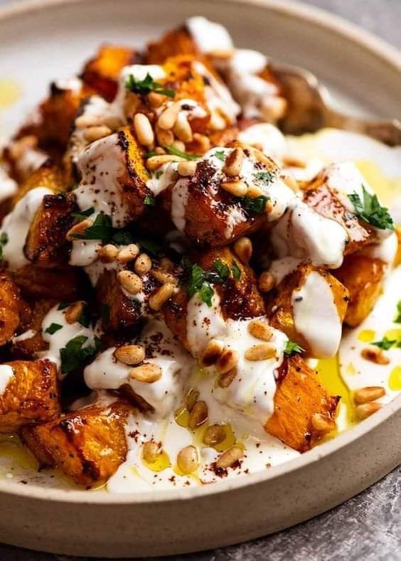 Enjoy your flavorful and vibrant roasted pumpkin dish with creamy lemon yogurt sauce and crunchy pine nuts!