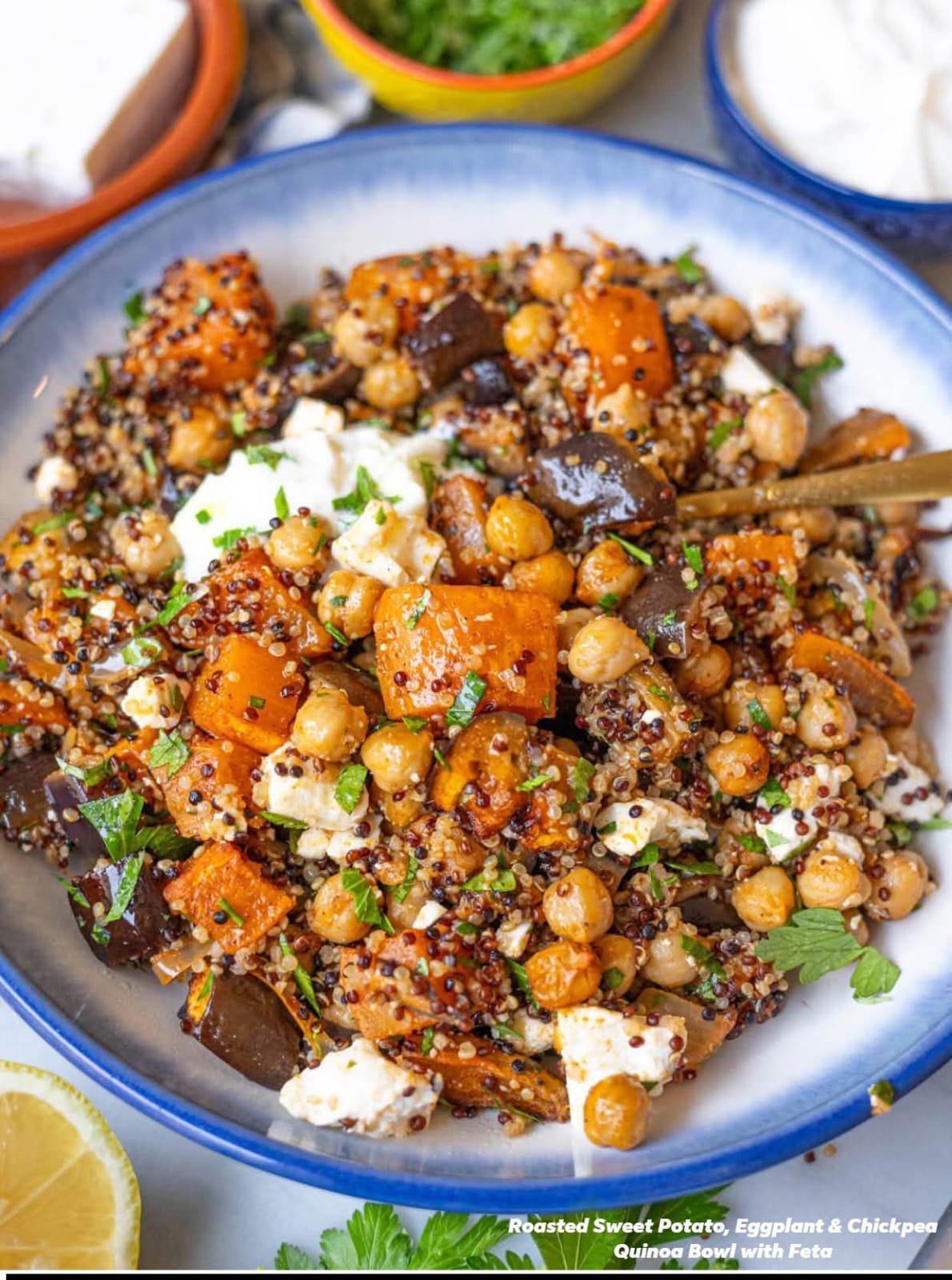 Roasted Sweet Potato, Eggplant & Chickpea Quinoa Bowl With Feta
