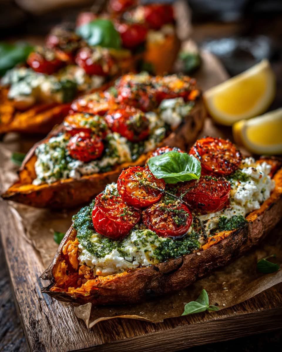 Roasted Sweet Potatoes Stuffed with Ricotta, Cherry Tomatoes, and Pesto is a simple yet elegant dish that highlights fresh ingredients and vibrant flavors. The sweetness of roasted potatoes combined with creamy ricotta, juicy tomatoes, and aromatic pesto creates a delicious balance that is both comforting and nutritious. Perfect as a vegetarian main dish or a satisfying side, this recipe is easy to customize and sure to become a favorite in your kitchen.