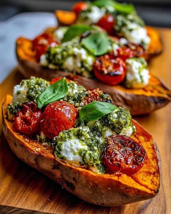 Tender roasted sweet potatoes are stuffed with creamy ricotta, juicy cherry tomatoes, and fragrant basil pesto.